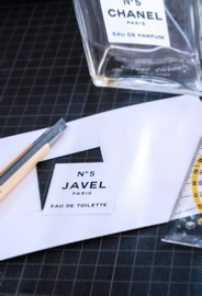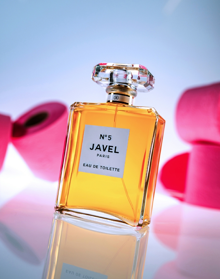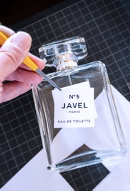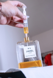 So wurde diesmal aus dem weltberühmten eau de parfum ein eau de toilette, zumal Javelwasser (Chlorbleiche) im französischen und schweizer Raum eben auch zur Reinigung von Sanitärmöbeln genutzt wird. Die größte Herausforderung hierbei war die farbliche und stoffliche Annäherung der Ersatzflüssigkeit an die des Originals. Meine diesbezüglichen alchemistischen Experimente wurden nach anfänglicher Stümperei schliesslich von Erfolg gekrönt und das Ergebnis kann sich sehen lassen.